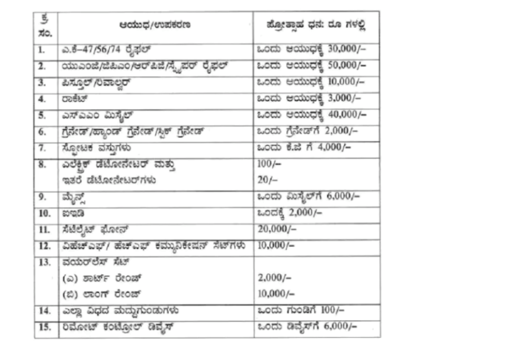 ನಕ್ಸಲರು ತಮ್ಮ ಬಳಿ ಇರುವ ಶಸ್ತ್ರಾಸ್ತ್ರ ಹಾಗೂ ಆಯುಧಗಳನ್ನು ನೀಡಿದರೂ ಸಹ ಅವುಗಳಿಗೆ ತಕ್ಕಂತೆ ಪ್ರೋತ್ಸಾಹ ಧನ ನೀಡಲಾಗುತ್ತದೆ. ಯಾವುದಕ್ಕೆ ಎಷ್ಟು ಹಣ ಎನ್ನುವ ವಿವರ ಈ ಕೆಳಗಿನಂತಿದೆ.
