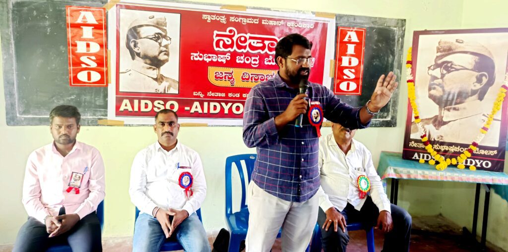 ಮುಖ್ಯ ಭಾಷಣಕಾರ AIDSO ರಾಜ್ಯ ಉಪಾಧ್ಯಕ್ಷ ಹಣಮಂತ ಎಸ್.ಎಚ್ ಮಾತನಾಡಿ, ಇವತ್ತು ನಮ್ಮನ್ನು ಆಳುತ್ತಿರುವ ಪಕ್ಷಗಳು ಶಿಕ್ಷಣವನ್ನು ಸಂಪೂರ್ಣವಾಗಿ ಖಾಸಗಿಕರಣ ಮಾಡುತ್ತಿವೆ. 4 ಸಾವಿರ ಸರಕಾರಿ ಶಾಲೆಗಳನ್ನು ಮುಚ್ಚುವ ಹುನ್ನಾರ ನಡೆದಿದೆ. ಬಡ ಮಕ್ಕಳಿಗೆ ಶಿಕ್ಷಣ ದೂರಗೊಳ್ಳುತ್ತಿದೆ, ಮತ್ತೊಂದೆಡೆ ರೈತ ಕಾರ್ಮಿಕರ ವಿರೋಧಿ ನೀತಿಗಳನ್ನು ತಂದು ರೈತ ಕಾರ್ಮಿಕರನ್ನು ಸಂಕಷ್ಟದಲ್ಲಿ ಇರಿಸಿದೆ. ಇವತ್ತು ಶಿಕ್ಷಣದಲ್ಲಿ ಕೋಮುವಾದಿ ಜಾತಿ, ಧರ್ಮ ವಿಷಯಗಳನ್ನು ಹರಡಿಬಿಡುತ್ತಿದೆ. ಇನ್ನೊಂದೆಡೆ ಸಮಾಜದಲ್ಲಿ ಕುಸಿಯುತ್ತಿರುವ ನೈತಿಕ ಮೌಲ್ಯಗಳ ಕೊರತೆ ವಿದ್ಯಾರ್ಥಿ ಯುವಕರನ್ನು ನೈಜ ವಿಷಯಗಳಿಂದ ದಾರಿ ತಪ್ಪಿಸುತ್ತಿವೆ. ಇದರಿಂದ ಪ್ರತಿದಿನ ವಯಸ್ಸಿನ ಮಿತಿ ಇಲ್ಲದೆ ಸಣ್ಣ ಮಕ್ಕಳಿಂದ ವೃದ್ಧರವರೆಗೆ ಅತ್ಯಾಚಾರ ದೌರ್ಜನ್ಯ ಹೆಚ್ಚಾಗುತ್ತಿವೆ. ಇಂತಹ ಪರಿಸ್ಥಿತಿಯಲ್ಲಿ ನೇತಾಜಿ ಸುಭಾಷ್ ಚಂದ್ರ ಬೋಸ್ ರ ಇಂತಹ ಮಹಾನ್ ವ್ಯಕ್ತಿಗಳು ಸಂಘರ್ಷ ಭರಿತ ಜೀವನ ಹಾಗೂ ವಿಚಾರಗಳ ಅವಶ್ಯಕತೆ ಇದೆ ಎಂದರು.