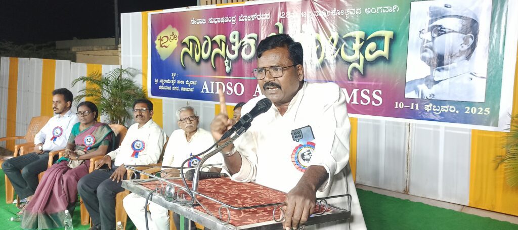 ನಗರದ ಸಿದ್ದರಾಮೇಶ್ವರ ಶಾಲಾ ಮೈದಾನದಲ್ಲಿ ಎಐಡಿಎಸ್ಓ ಎಐಡಿವೈಓ ಹಾಗೂ ಎಐಎಂಎಸ್ಎಸ್ ಸಂಘಟನೆಯ ನೇತೃತ್ವದಲ್ಲಿ ಹಮ್ಮಿಕೊಳ್ಳಲಾಗಿದ್ದ ನೇತಾಜಿ ಸುಭಾಷ್ ಚಂದ್ರ ಬೋಸ್ ರವರ 128ನೇ ಜನ್ಮದಿನದ ಅಂಗವಾಗಿ ನಡೆದ 12ನೇ ಸಾಂಸ್ಕೃತಿಕ ಜನೋತ್ಸವ ಕಾರ್ಯಕ್ರಮದಲ್ಲಿ ಮುಖ್ಯ ಭಾಷಣಕಾರರಾಗಿ ಮಾತನಾಡಿದ ಅವರು, ಭಾರತ ದೇಶದ ಇಂತಹ ಪರಿಸ್ಥಿತಿ ಮನಗಂಡು, ನೇತಾಜಿಯವರ ವಿಚಾರ ಆದರ್ಶ ಮೌಲ್ಯಗಳನ್ನು ಎತ್ತಿ ಹಿಡಿಯುವುದು ಅವಶ್ಯಕವಾಗಿದೆ. ಸಿನಿಮಾ ನಟರು, ಕ್ರೀಡಾ ತಾರೆಯರು, ನಾಯಕರು ನಮಗೆ ಸ್ಪೂರ್ತಿ ಅಲ್ಲಾ, ನಿಜವಾದ ಸ್ಪೂರ್ತಿ ಎಂದರೆ ನೇತಾಜಿ ಸುಭಾಷ್ ಚಂದ್ರ ಬೋಸ್ ಅವರು ಆಗಬೇಕು ಎಂದರು.
