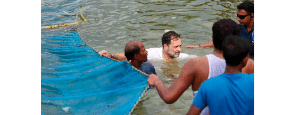 ಕೊಳ ತಲುಪಿದ ರಾಹುಲ್ ಬಲೆ ಬೀಸುತ್ತಿರುವ ಮೀನುಗಾರರನ್ನು ಭೇಟಿ ಮಾಡಲು ಸಣ್ಣ ದೋಣಿ ಹತ್ತಿದರು. ಈ ಸಂದರ್ಭದಲ್ಲಿ ಕನ್ಹಯ್ಯ ಕುಮಾರ್ ನೀರಿಗೆ ಹಾರಿದಾಗ ರಾಹುಲ್ ಹಾರಿದರು. ಈ ವೇಳೆ ಅಲ್ಲಿ ಸೇರಿದ್ದ ಗ್ರಾಮಸ್ಥರು ಚಪ್ಪಾಳೆ ತಟ್ಟಿ ಮೆಚ್ಚುಗೆ ವ್ಯಕ್ತಪಡಿಸಿದರು.
