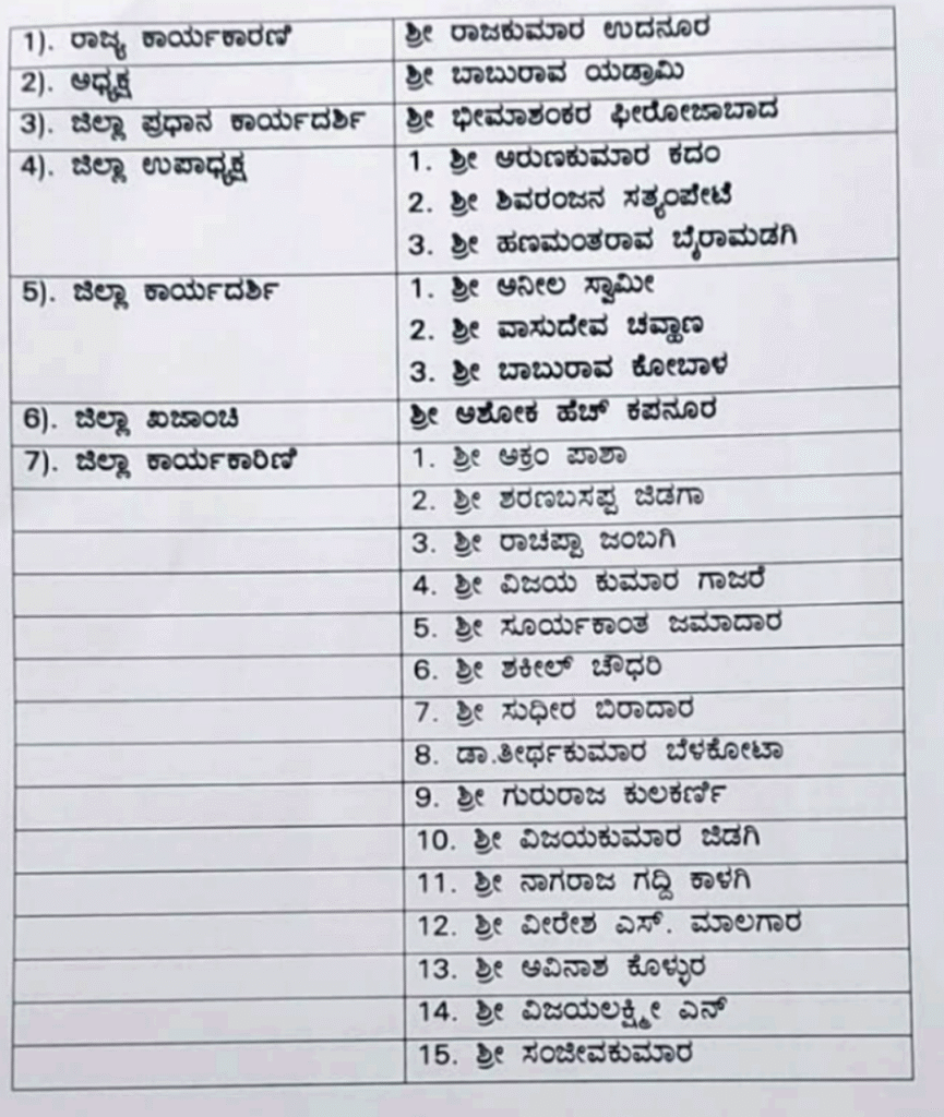 ಹನಮಂತರಾವ್ ಭೈರಮಡಗಿ, ಜಿಲ್ಲಾ ಕಾರ್ಯದರ್ಶಿಯಾಗಿ ವಾಸುದೇವ್ ಚವ್ಹಾಣ, ಅನೀಲ್ ಸ್ವಾಮಿ, ಬಾಬುರಾವ್ ಕೋಬಾಳ ಮತ್ತು ಜಿಲ್ಲಾ ಖಜಾಂಚಿಯಾಗಿ ಅಶೋಕ ಕಪನೂರ ಆಯ್ಕೆಯಾಗಿದ್ದಾರೆ.