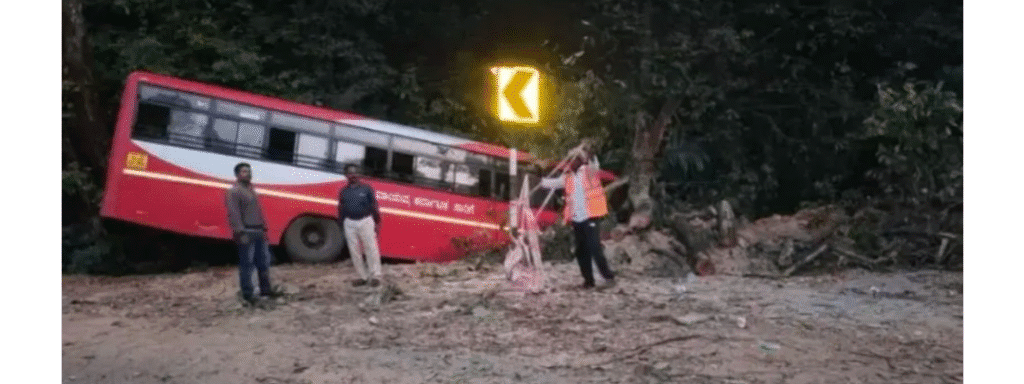 ಕಾರವಾರ: ಸಾರಿಗೆ ಬಸ್ವೊಂದು ಚಾಲಕನ ನಿಯಂತ್ರಣ ತಪ್ಪಿ ರಸ್ತೆಯ ಪಕ್ಕದ ತಗ್ಗು ಪ್ರದೇಶಕ್ಕೆ ಉರುಳಿ ಬಿದ್ದು, ಮರಕ್ಕೆ ಡಿಕ್ಕಿ ಹೊಡೆದ ಘಟನೆ ತಾಲೂಕಿನ ಗೇರುಸೊಪ್ಪಾದ ಸೂಳೆಮುರ್ಕಿ ಕ್ರಾಸ್ ಬಳಿ ರಾಷ್ಟ್ರೀಯ ಹೆದ್ದಾರಿ 69ರಲ್ಲಿ ನಡೆದಿದೆ.