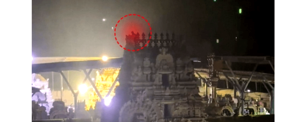 ಭಕ್ತರಂತೆ ದೇವಸ್ಥಾನ ಪ್ರವೇಶ ಮಾಡಿದ್ದ ಈತ ಟೆಂಟ್ ಕಂಬ್ಗಳನ್ನು ಹತ್ತಿ ನೇರವಾಗಿ ಗರ್ಭಗುಡಿಯ ಮೇಲಿರುವ ಗೋಪುರ ಏರಿದ್ದಾನೆ. ಗೋಪುರ ಮೇಲಿರುವ ಕಲಶಗಳಿರುವ ಜಾಗವನ್ನು ತಲುಪಿ ಮದ್ಯ ಕೊಡುವಂತೆ ವಿಚಿತ್ರ ಬೇಡಿಕೆ ಇಟ್ಟಿದ್ದಾನೆ.